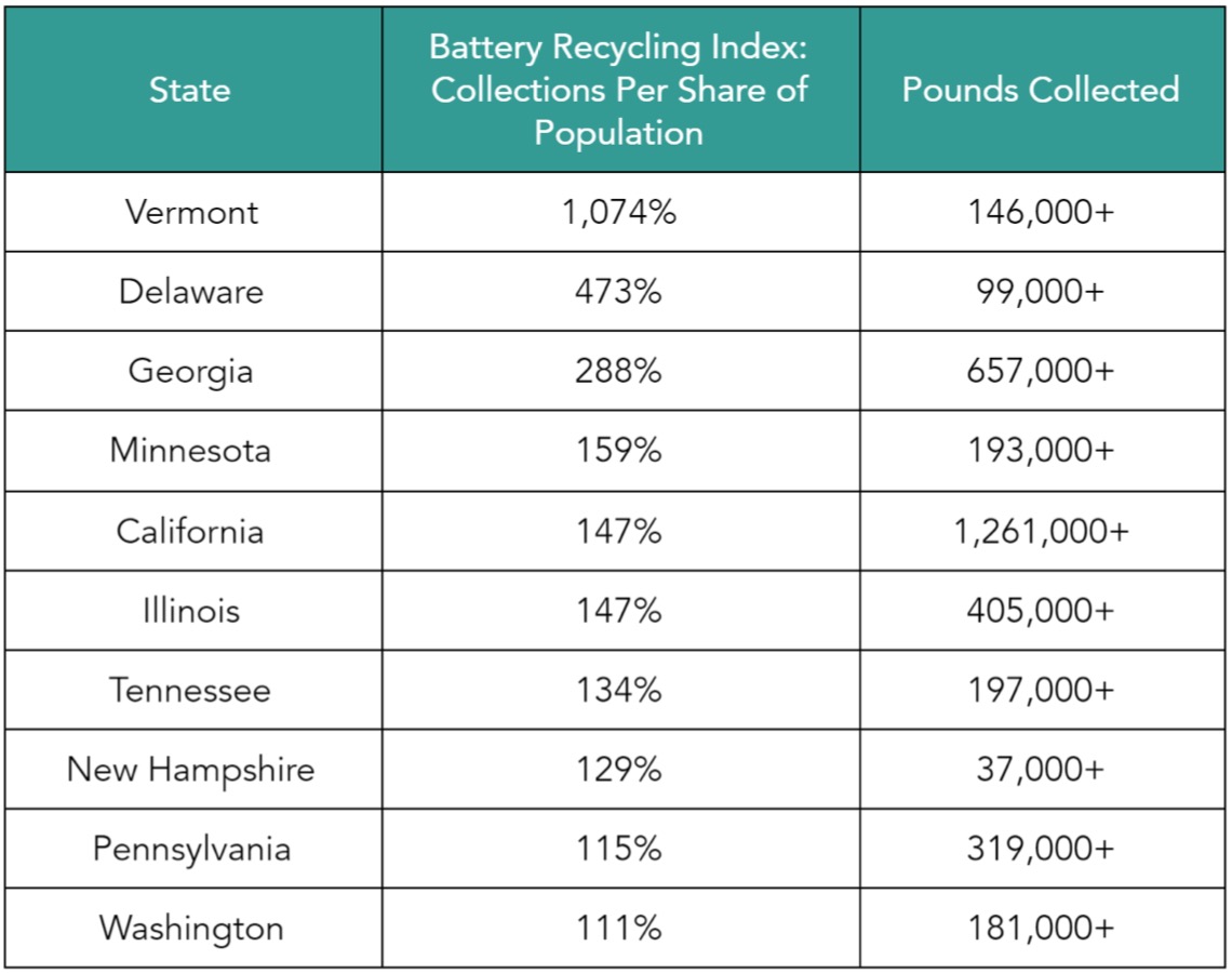 Contributing factors driving the top 10 states performance included strong participation from manufacturers along with public collection networks (municipalities and retailers). A surge in the removal and management of damaged batteries from the market and education awareness efforts also complemented collection efforts.